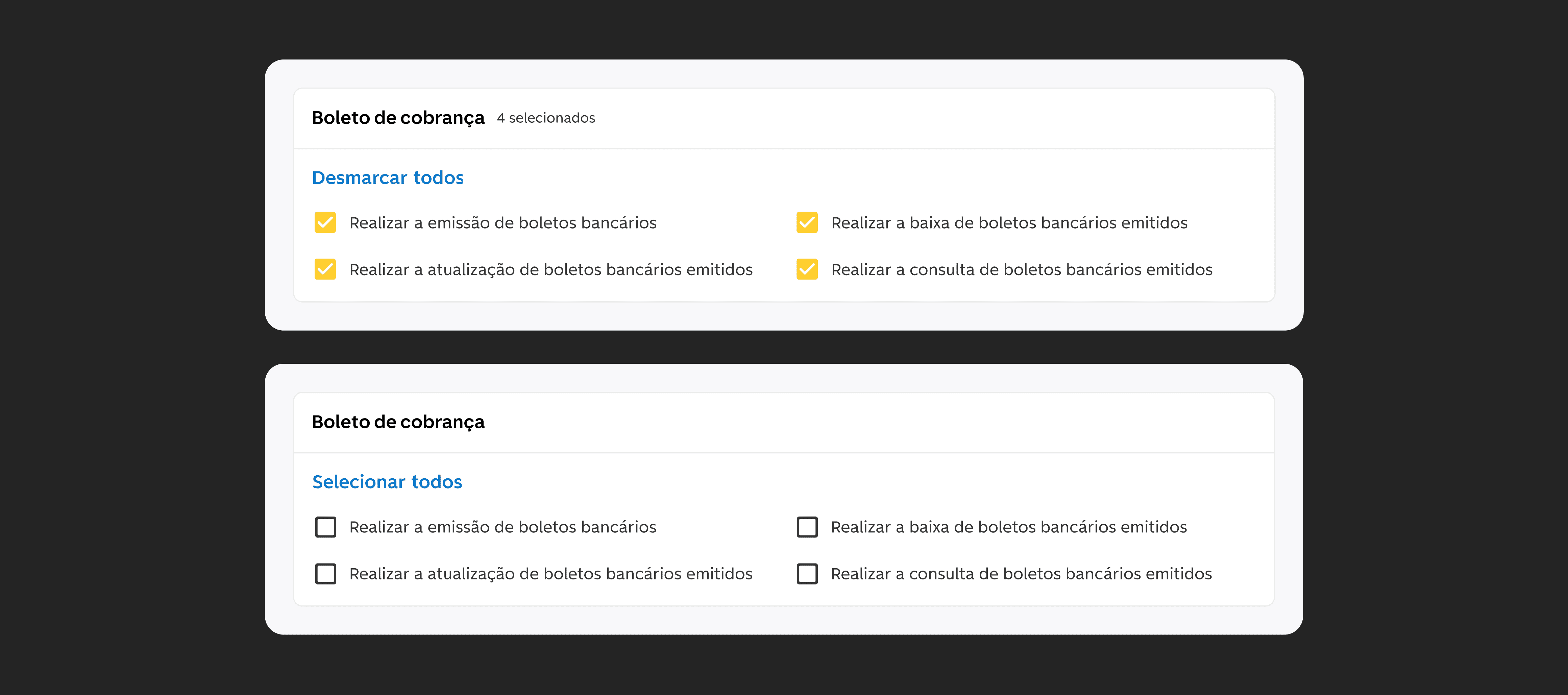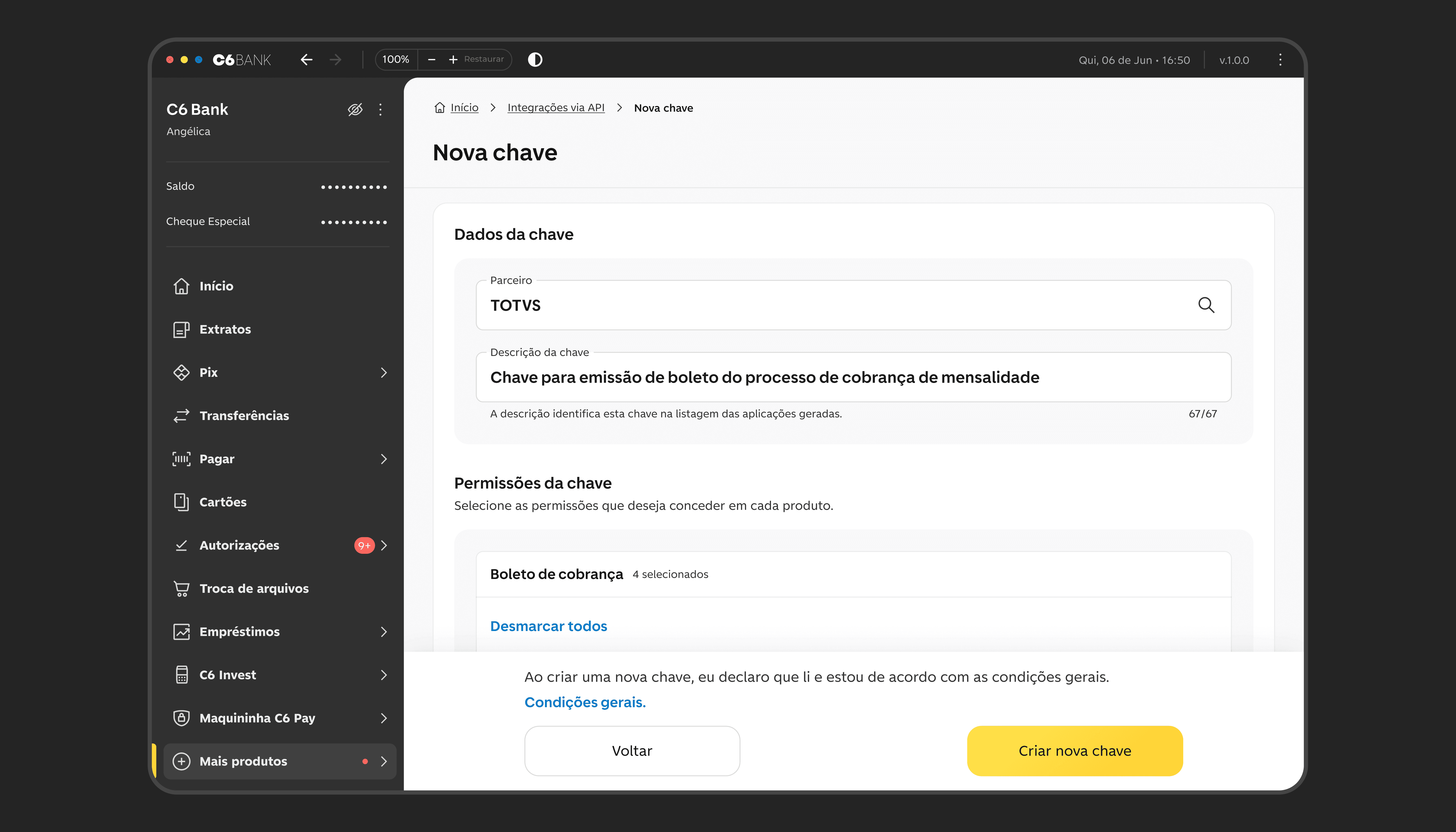 Estruturamos o fluxo de criação da chave para guiar o cliente na configuração da integração. O usuário seleciona o parceiro, define uma descrição para identificação futura e escolhe as permissões que serão concedidas, garantindo clareza sobre os acessos liberados.