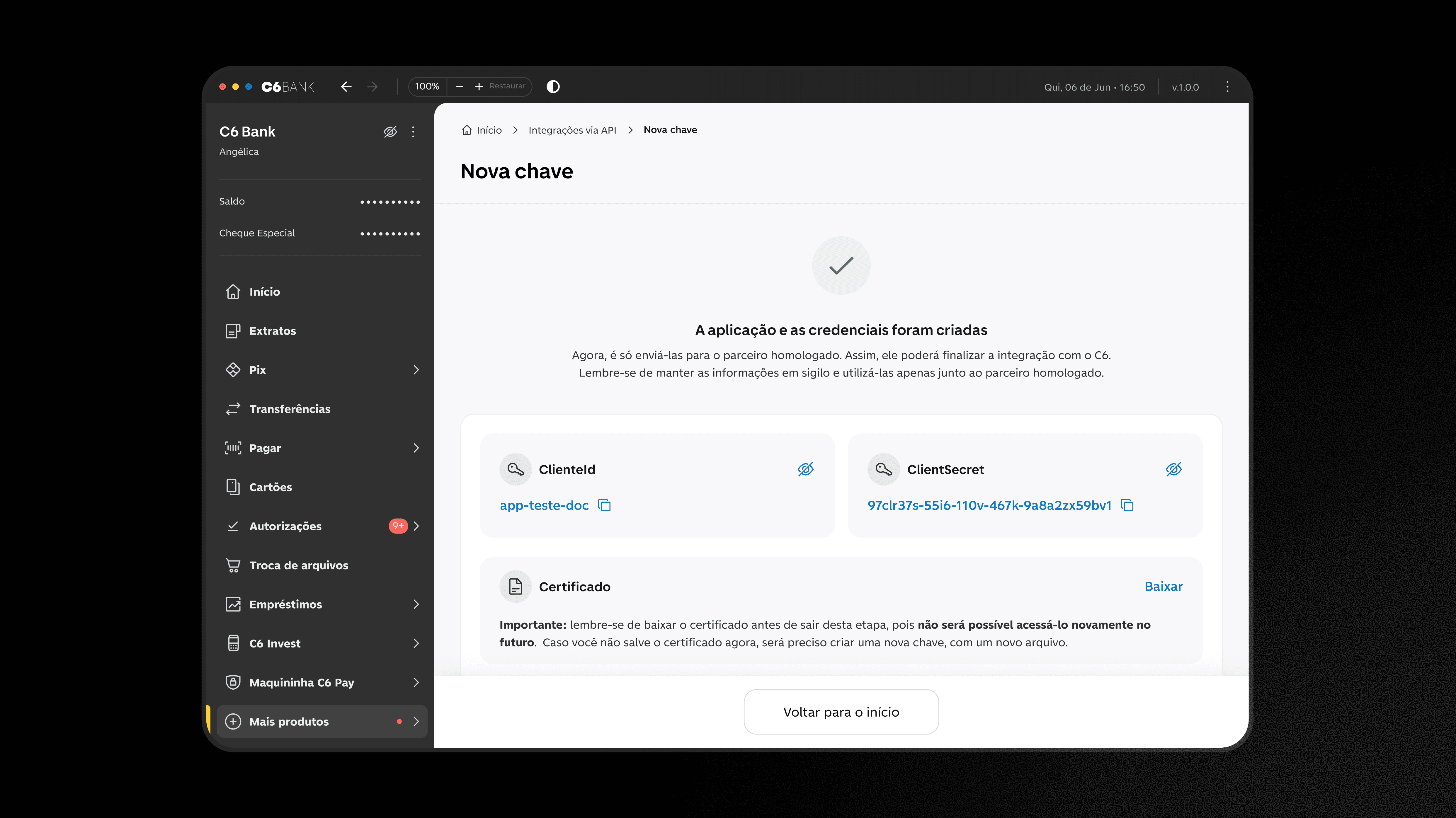 Após a criação da chave, o cliente recebe todas as informações necessárias para ativar a integração, incluindo ClientId, ClientSecret e certificado. A tela também apresenta um resumo da chave criada e das permissões concedidas.