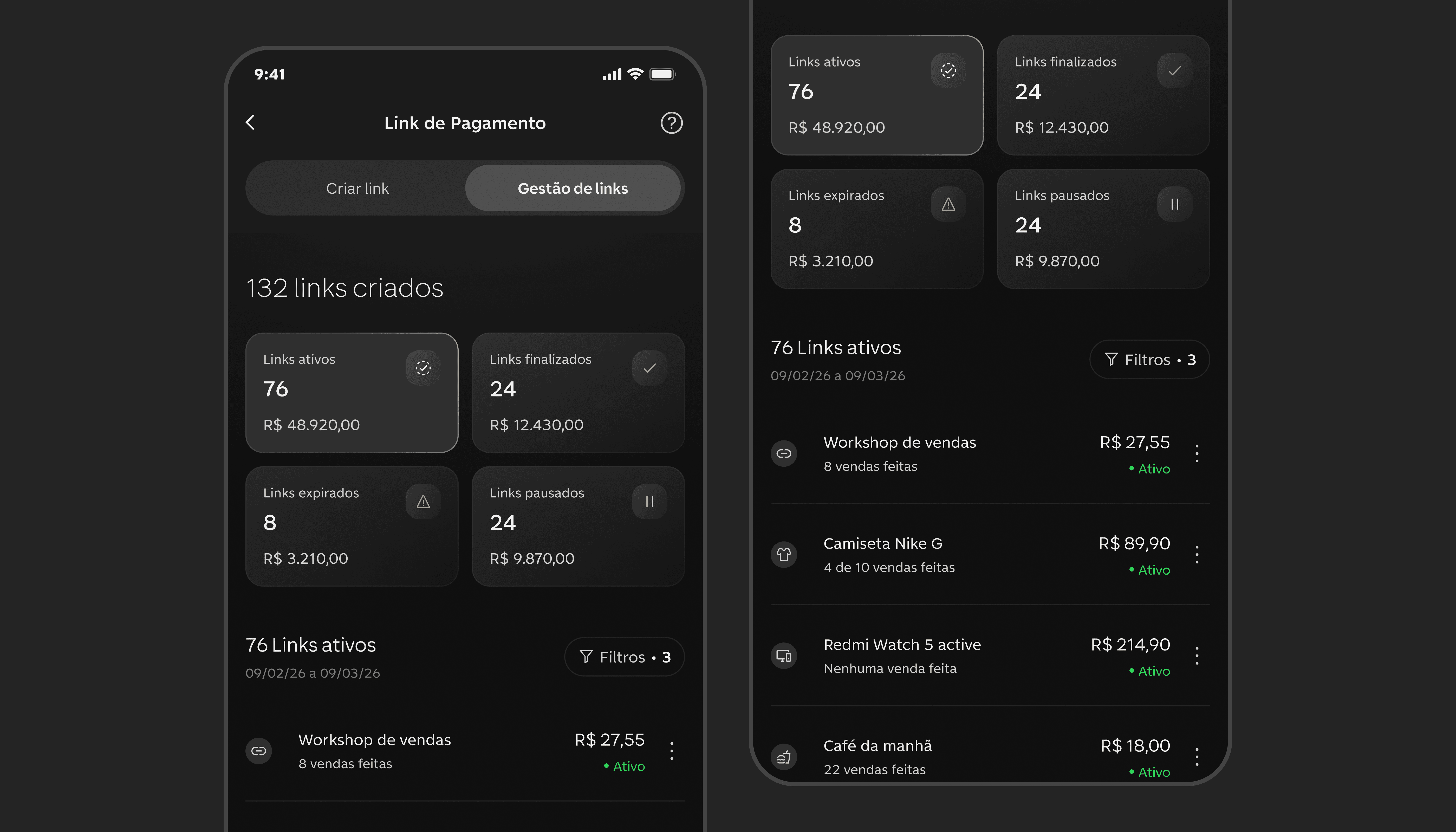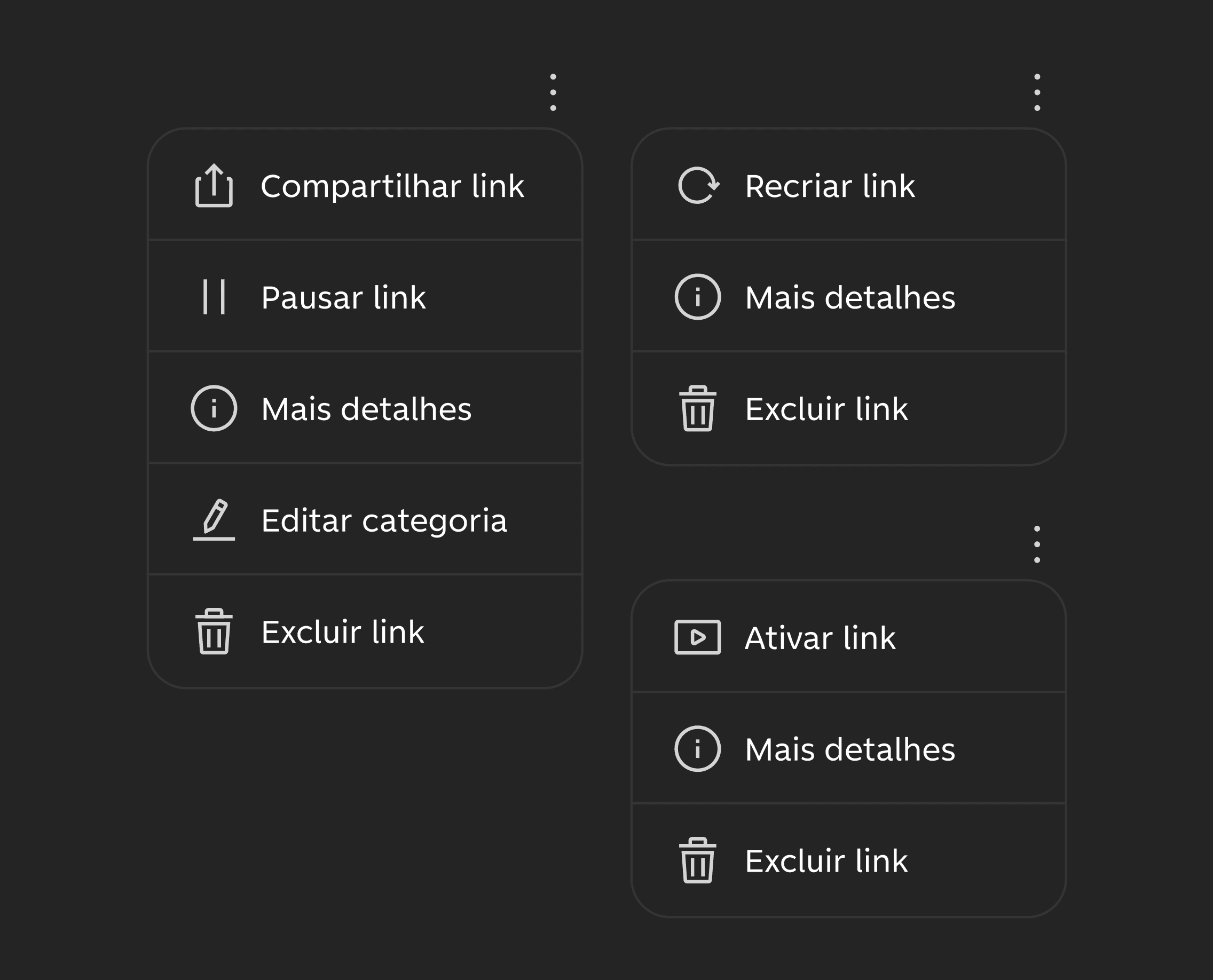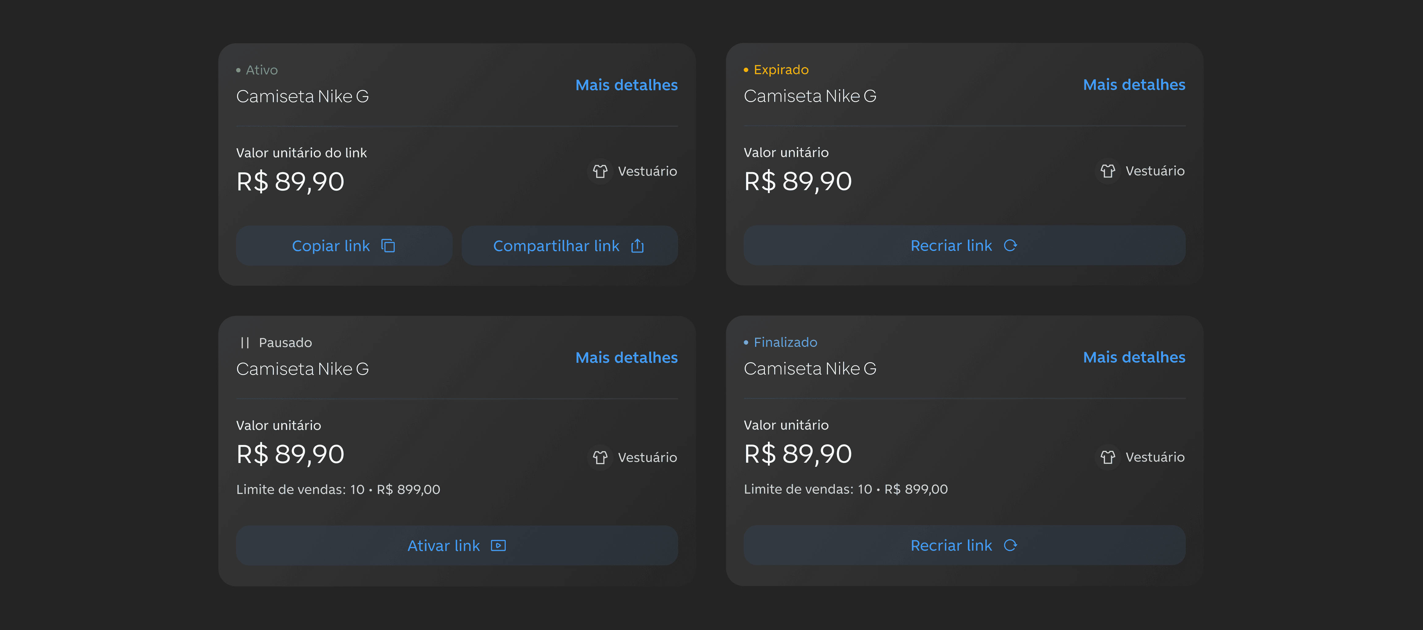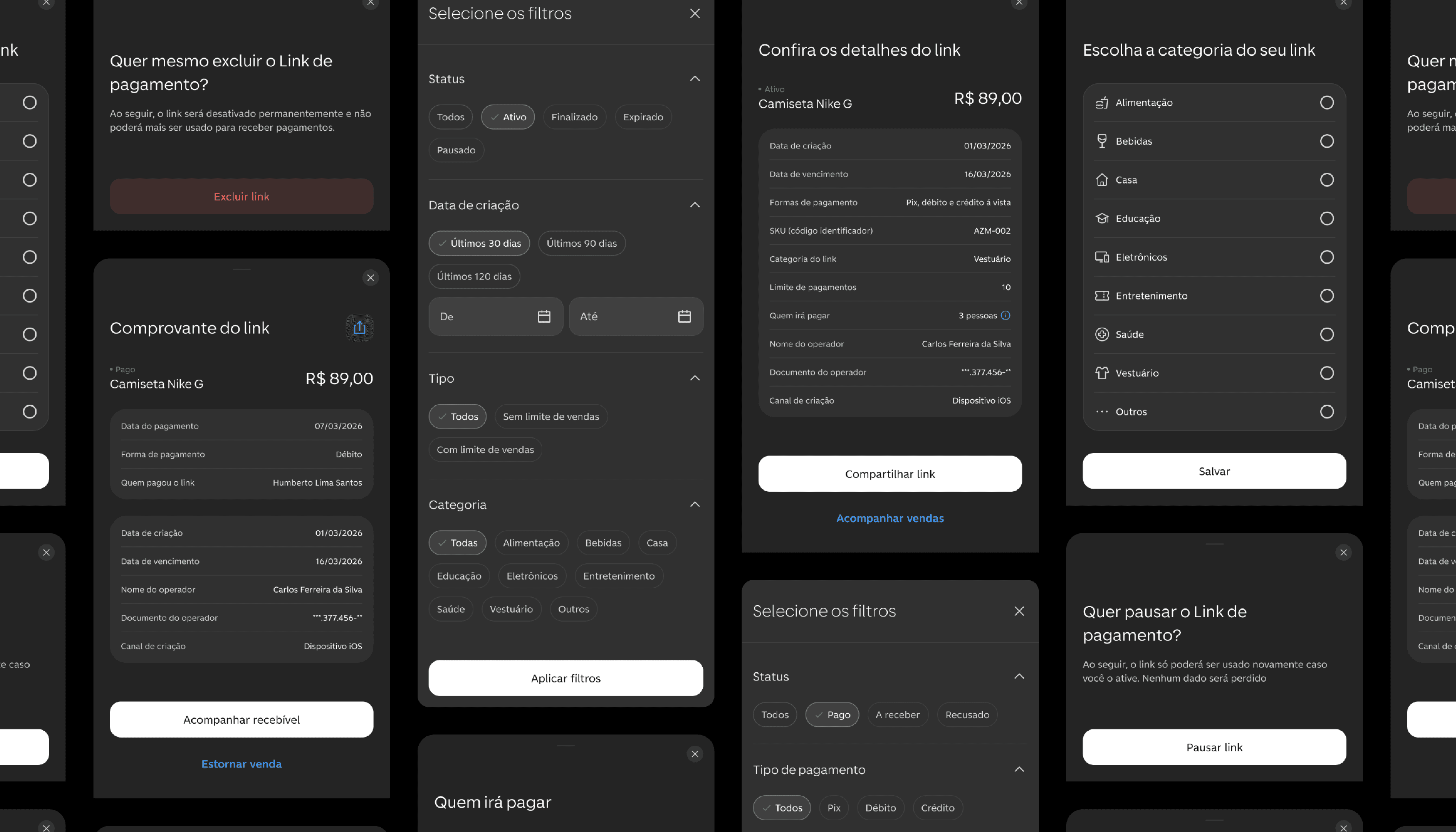 Também projetamos ações para gerenciar o ciclo de vida dos links, como visualizar detalhes da cobrança, categorizar o produto, acessar comprovantes, pausar ou excluir o link. Incluímos confirmações para ações críticas, reduzindo erros durante o gerenciamento.