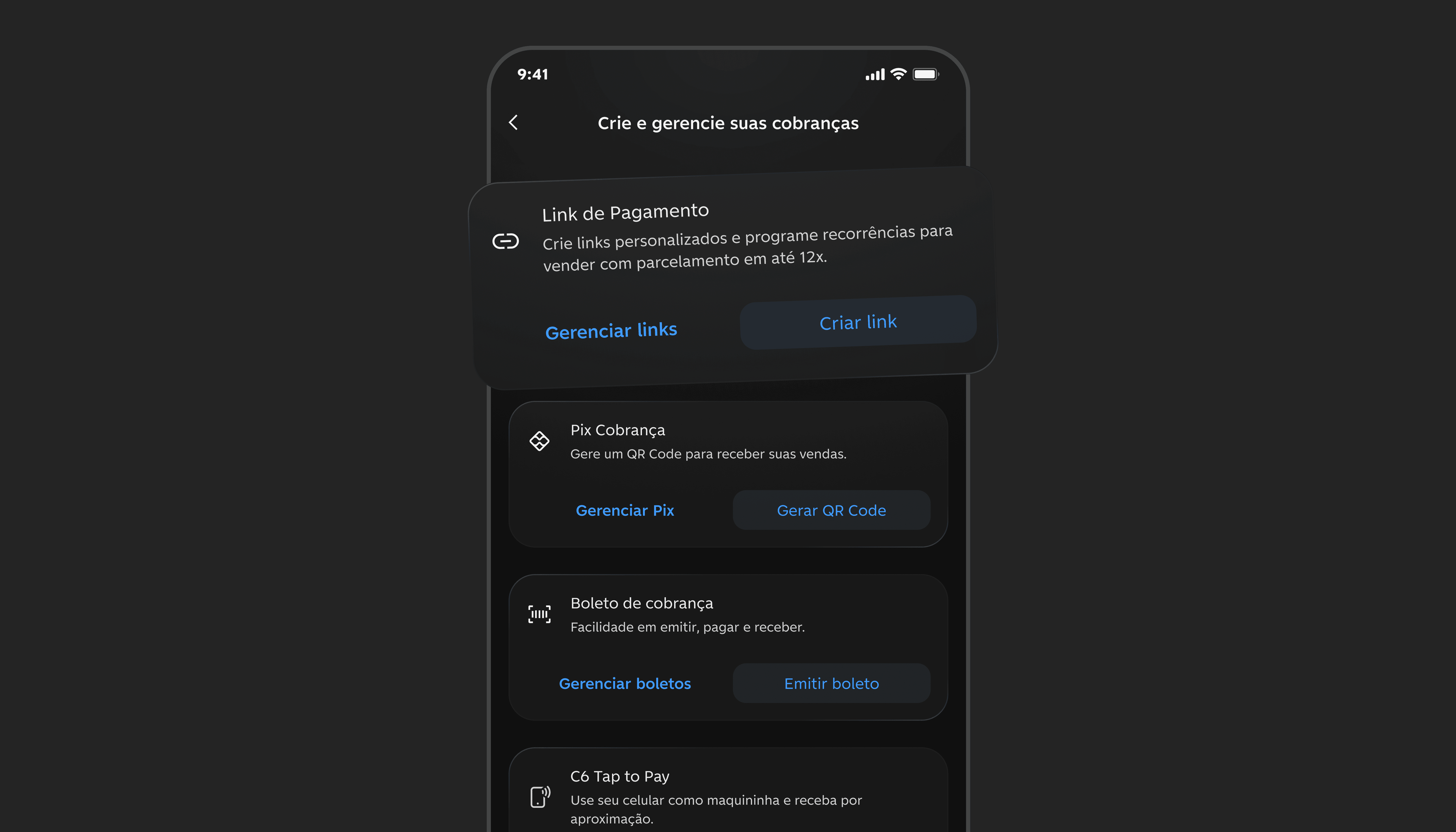 Reestruturamos a entrada do fluxo de cobrança para separar criação e gestão de links de pagamento. Antes, o usuário precisava iniciar o fluxo de criação para acessar links existentes. Agora ele pode ir direto para gerenciar ou criar links, reduzindo fricção para quem utiliza o recurso com frequência.